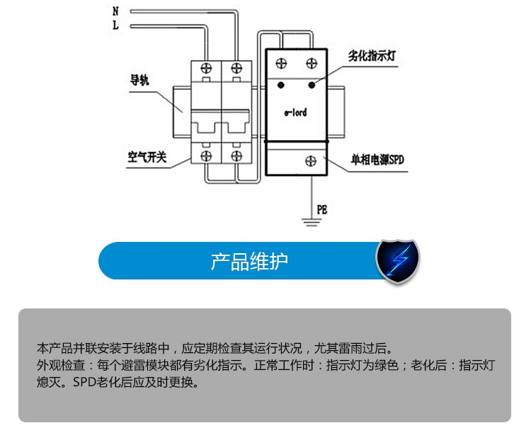 1. 已有可靠接地系統(tǒng),在配電柜(避雷器安裝處)的接地樁 (條)上進(jìn)行接地電阻的測(cè)定,電阻應(yīng)符合相關(guān)規(guī)范要求。 (或滿足國(guó)家、部級(jí)標(biāo)準(zhǔn))。 2. 配電柜中應(yīng)留有安裝避雷器的空間, 注:L為電源相線;N為電源零線;PE為地線。 | 應(yīng)檢查空氣開(kāi)關(guān)已經(jīng)合閘導(dǎo)通,以保證避雷器處于運(yùn)行狀態(tài); 不要在雷雨天安裝。 |